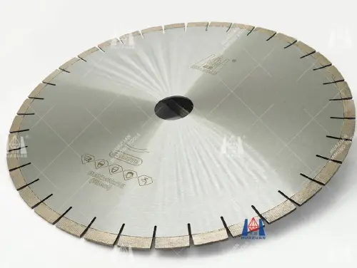 These blades feature a robust, tensioned steel core and wear-resistant bond. The hot-pressed or laser welded segments are formulated for cutting hard granite, ensuring consistent performance and long tool life in demanding factory environments.
