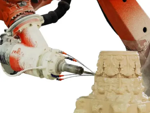 The robot creates garden fountains, planters, and decorative blocks with integrated water channels and mounting features, all programmed from CAD models for precise dimensional control. Weather-resistant carvings maintain their appearance and structural integrity for decades.