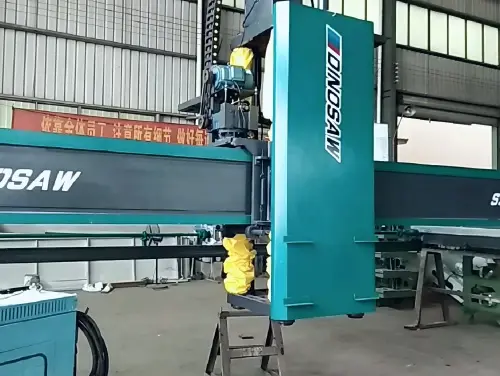 DINOSAW stone cutting machines achieve ±0.2mm cutting height precision through hydraulic lifting systems, exceeding industry standard ±0.5mm tolerance by 150%. This accuracy comes from cast bridge structure with large-diameter guide columns and reinforced beams that eliminate vibration-induced deviations. Gear rack technology ensures consistent slab thickness across multiple cuts. The combination of hydraulic precision control and robust mechanical structure maintains dimensional consistency even during processing hundreds of stone blocks.
